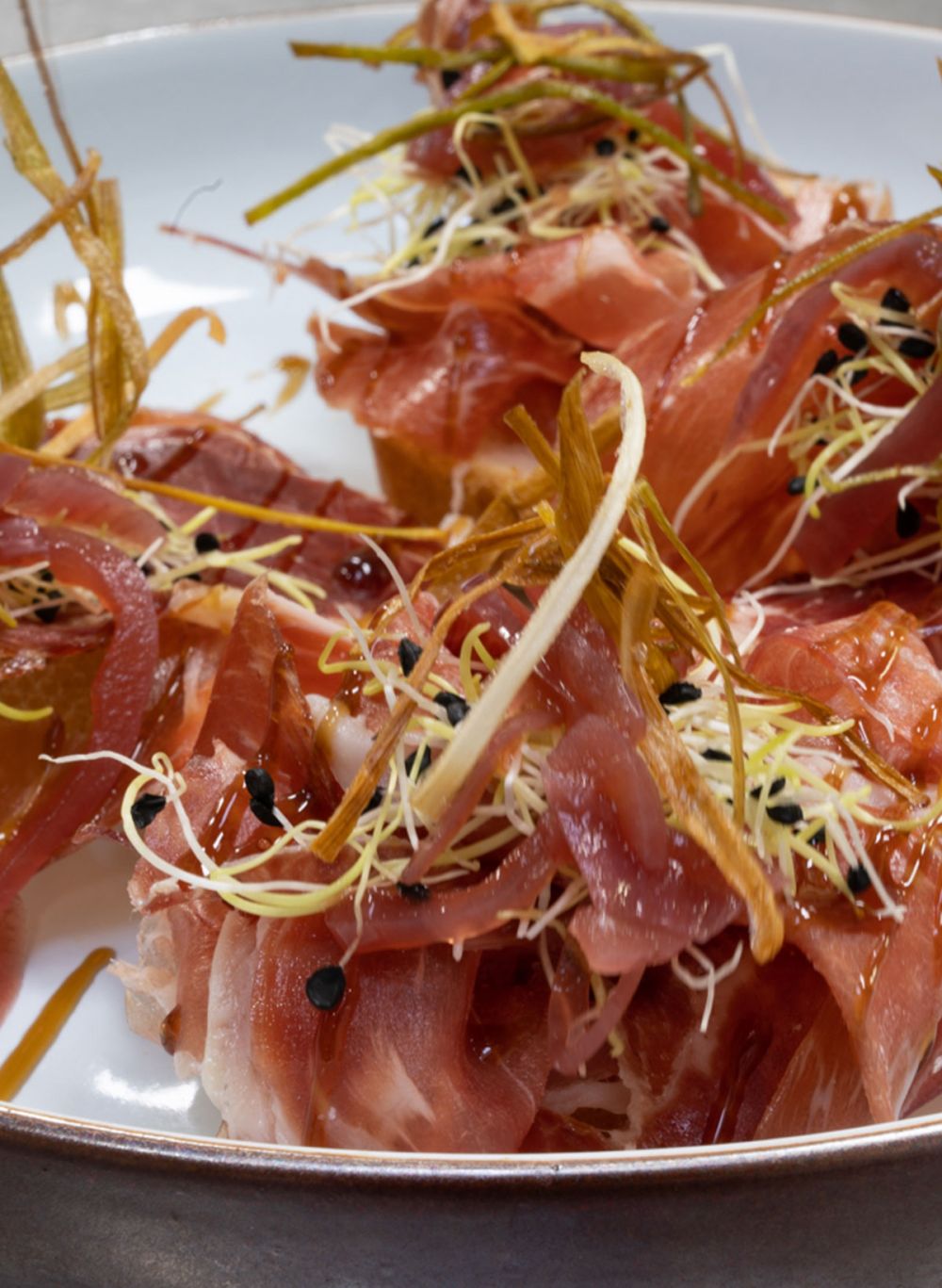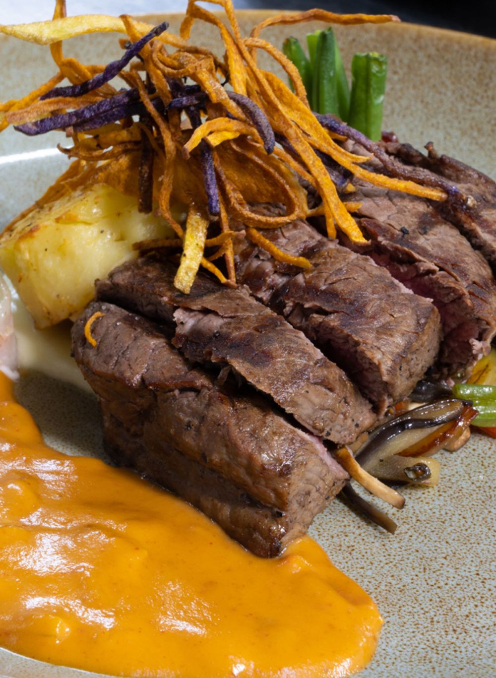 Gedroogde Ossenhaas | Mango | Rode uien confituren